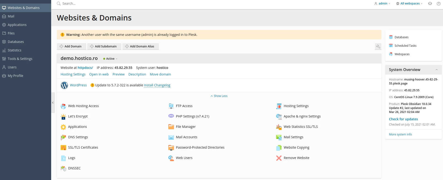 - Wenn der Authentifizierungsprozess erfolgreich war, wird die Plesk-Administrationsoberfläche für das jeweilige Hosting geöffnet.