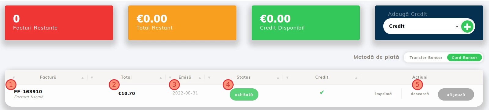 • (3) Ausstellungsdatum - stellt das Datum dar, an dem die Proforma vom System ausgestellt wurde (zu beachten - Proformarechnungen werden automatisch 2 Wochen vor dem Fälligkeitsdatum vom System ausgestellt) für den Dienst, der verlängert werden soll (für Hosting) und verlängert wird (für Domain);
